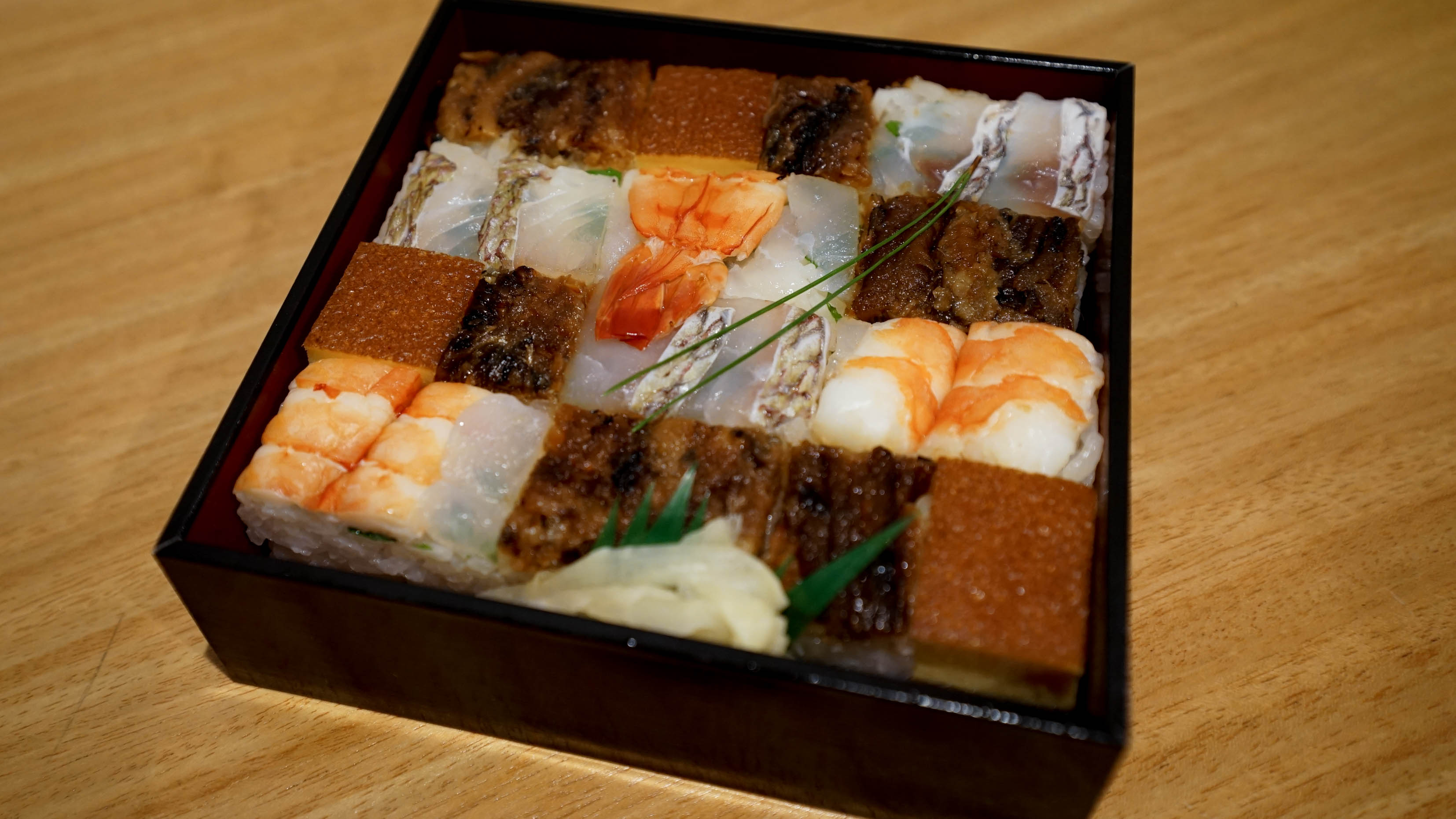 精美的禮盒裝外型,幾款壽司分成小件整齊排列在盒中。分別由小鯛魚,星鰻,玉子和蝦壽司組成,還配著幾片子薑。